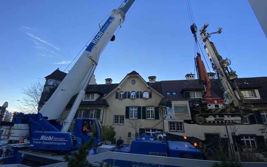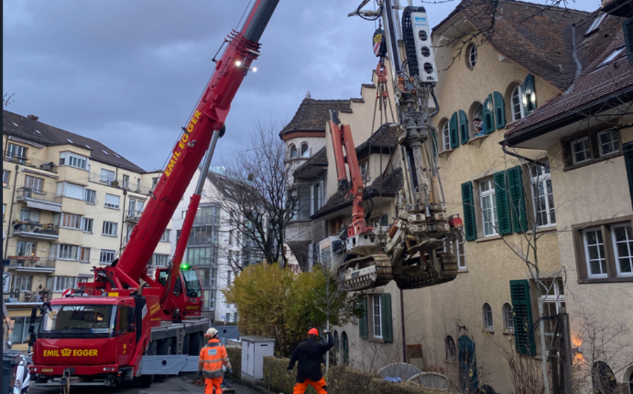 Im Zuge der detaillierten Planung entwickelte die Omneo AG eine alternative und technisch überzeugende Lösung. Die Erdsondenbohrungen wurden auf die terrassierte Rückseite der Liegenschaften verlegt. Aufgrund des rund drei Meter tiefer liegenden Vorplatzes war ein Kranhub erforderlich, um das Bohrgerät zu positionieren. Dieser Mehraufwand ermöglichte es jedoch, Eingriffe in die denkmalgeschützten Vorgärten vollständig zu vermeiden und das Bewilligungsverfahren deutlich zu vereinfachen.