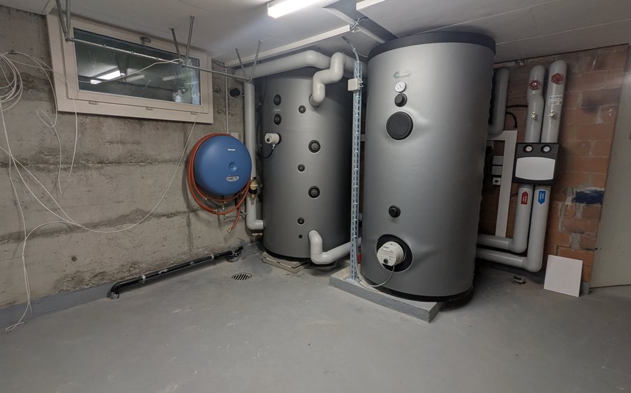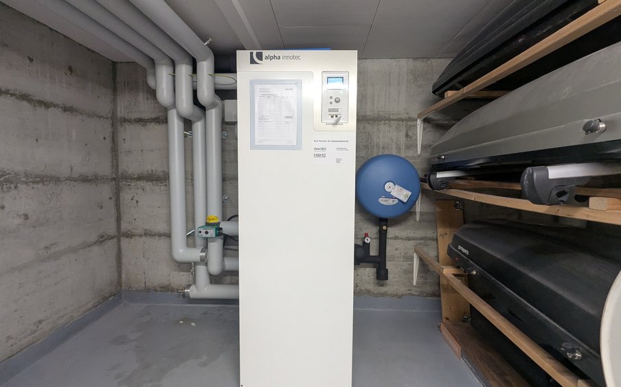 Für die Nutzung der Erdwärme wurden anfangs insgesamt drei Erdsonden mit einer Tiefe von je 230 Metern gebohrt. Zum Einsatz kam eine Erdsonden-Wärmepumpe des Typs Alpha Innotec NP BWV 28 mit zwei integrierten Kompressoren. Diese arbeiten in einer Master/Slave-Logik innerhalb eines Geräts. Ein Kompressor deckt somit den Grundbedarf ab, während der zweite Kompressor bei höherem Leistungsbedarf zugeschaltet wird. Diese Kombination ermöglicht eine sehr feine Leistungsanpassung im Teillastbereich sowie ausreichend Leistung bei Spitzenlasten. Ergänzt wird das System durch einen 800 Liter Pufferspeicher sowie einen 800 Liter Boiler. Dadurch wird eine stabile Wärmeverteilung und eine zuverlässige Warmwasserversorgung für das gesamte Mehrfamilienhaus sichergestellt.