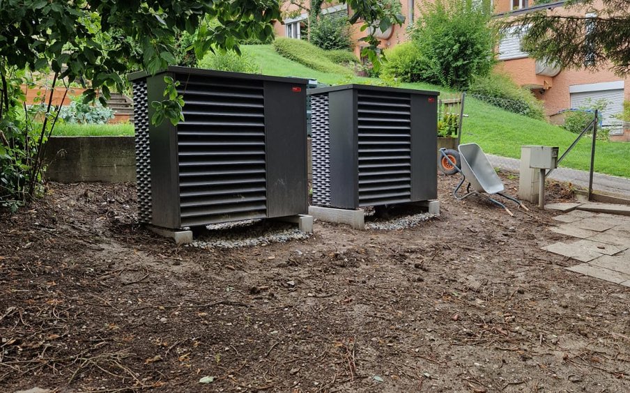 Da am Standort der Liegenschaft Erdsondenbohrungen aufgrund der kantonalen Grundwasserbestimmungen nicht zulässig sind und das Gebäude über eine Radiatorenheizung mit entsprechend höheren Vorlauftemperaturen verfügt, fiel die Wahl schliesslich auf eine Anlage mit zwei aussenaufgestellten Luft/Wasser-Wärmepumpen.