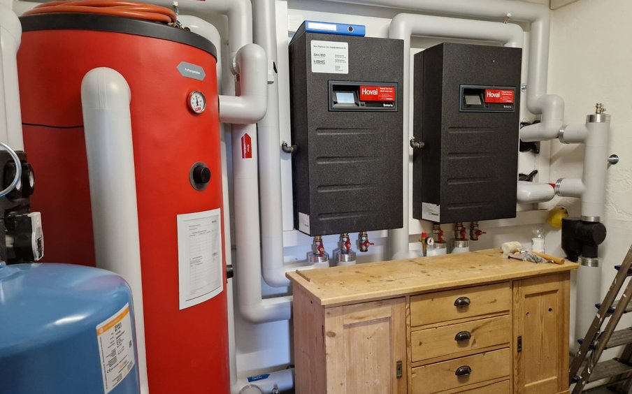 Als Wärmeerzeuger wurden zwei Hoval Belaria pro comfort (15) installiert. Die Wärmepumpen arbeiten mit dem natürlichen Kältemittel Propan (R290) und ermöglichen besonders hohe Vorlauftemperaturen von bis zu 70 °C. Diese Eigenschaft ist insbesondere bei Bestandsgebäuden mit Radiatoren entscheidend, um auch bei tiefen Aussentemperaturen ausreichend Wärme in die Räume zu bringen.