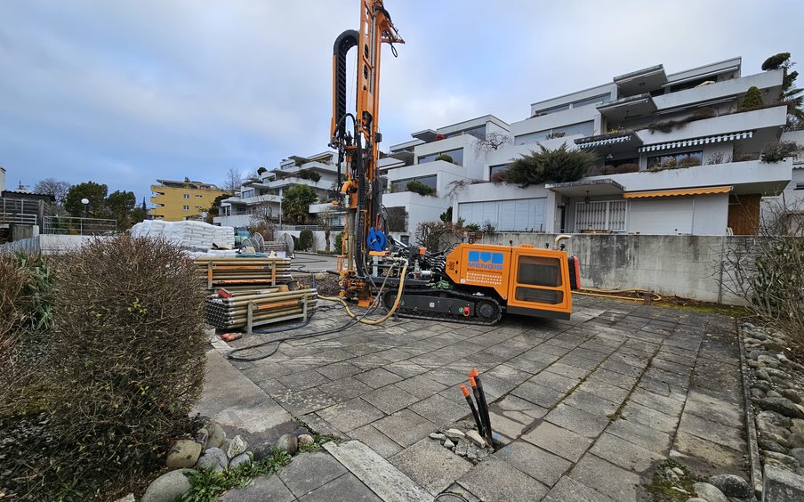 Bereits aus einem Nachbarsprojekt war bekannt, dass im Boden eine Störschicht vorhanden ist, die die Bohrung der Erdsonden erschweren könnte. Besonders herausfordernd war, dass sich diese Störschicht genau in der Mitte des Sondenfeldes zeigte. Einige Sonden konnten daher nicht auf die erforderliche Tiefe gebohrt werden. Dank der engen Zusammenarbeit mit der s3 GmbH, welche die Planung und Bauherrenvertretung übernahm, wurden verschiedene Lösungen mit zusätzlichen Bohrungen oder auch einer alternativen Wärmequelle mit Rückkühler zur Regeneration der Sonden erarbeitet. Es wurde eine TRT-Messung (Thermal Response Test) vorgenommen. Mithilfe dieser Resultate und mit Sondensimulationen konnte schliesslich eine Lösung mit zwei zusätzlichen Sondenbohrungen, aber ohne den Einsatz eines Rückkühlers realisiert werden.