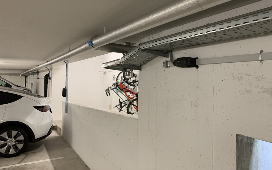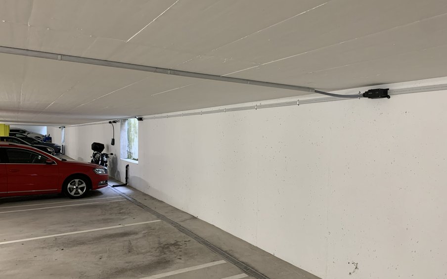 Die Omneo AG entwickelte ein Ausführungskonzept für die Ladeinfrastruktur in der gemeinsamen Tiefgarage. Für die 33 Parkplätze wurde eine Grundinfrastruktur mit Flachbandkabel erstellt. Dieses verläuft rund um die Garage, so dass jeder Parkplatz erschlossen wird. Bei Bedarf kann somit jeder Parkplatz mit einer eigenen E-Ladestation ausgestattet werden. Damit die Kapazitäten optimal ausgenutzt werden können, wurde ein dynamisches Lastmanagement installiert. Dieses intelligente System sorgt dafür, dass die verfügbare Energie optimal auf die angeschlossenen Fahrzeuge verteilt wird, sodass alle Fahrzeuge effizient geladen werden können, ohne die Netzkapazität zu überschreiten.